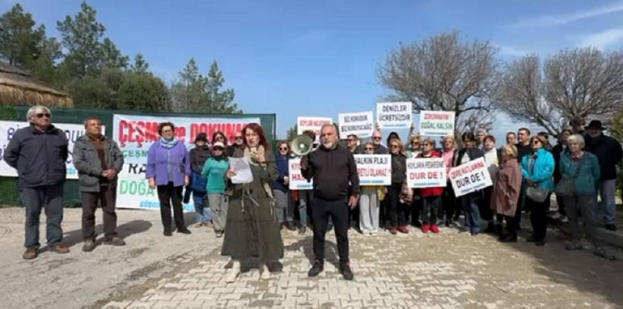 Çeşme sahillerinde mahkeme kararıyla yıkılması gereken 5 adet işletme olduğunu söyleyen Seher Gacar, “Sermayeye teslim edilen Aya Yorgi de halkın para vermeden özgürce denize girebileceği 1 metre yer kalmadı. Geçtiğimiz yaz sahillerin talanına dikkat çekmek için Çeşme’de, Urla’da, Karaburun’da eylemler yapıldı. Bir tek Gücücek Koyunu plaj işletmelerinin talanından koruyabildik. Onun dışında değişen hiç bir şey olmadı, tek bir işgalci işletme kapatılmadı, tek bir işgal sonlanmadı, Kıyı Kanunu’na, Tabiat Varlıklarını Koruma Kanunu’na, İmar Kanunu’na aykırı sahillerdeki tek bir kaçak yapı yıkılmadı. Gerekçe aynı; ‘teknik imkânsızlık’. Çeşme sahillerinde resmi verilere göre yıkım kararı kesinleşmiş 5 adet işletme var. Yıkılmıyor, yıkılamıyor. Devletimiz yol, baraj, hastane, toplu konut yapabiliyor ama doğayı katleden, vatandaşların anayasal haklarını gasp eden işletmelerin kaçak yapılarını yıkamıyor, işgaller sonlandıramıyor. Evet Aya Yorgi’de de kıyılar ticari işletmelerin istilası altında. Bu da yetmedi şimdi de doğal doku kazınarak, neolitik çağdan kalma tarihi eserler, seramikler kepçe ve dozerlerle parçalanarak, ağaçlar köklerinden sökülerek yeni bir plaj alanı yaratılmaya çalışılıyor. Üstelik arkeolojik Sit alanında, üstelik Doğal Sit alanında, üstelik kamuya, size bize ait alanda. Neolitik çağdan yani cilalı taş devrinden beri insan yaşamının olduğu bu bölge sanırız ki binlerce yıldır böyle bir barbarlık görmemiştir” ifadelerini kullandı.