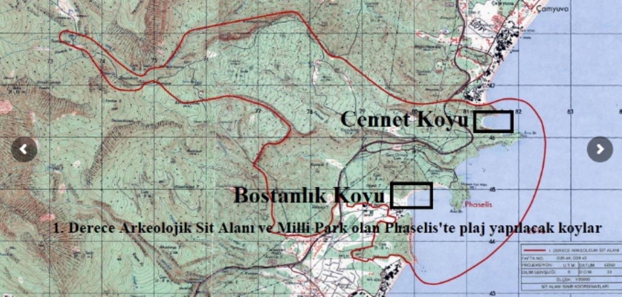 (Phaselis antik kentinin korunan alan sınırı 2016’dan sonra genişletilerek kuzey, kuzeybatı ve güneybatı yönlerinde genişletilmiş, sualtı arkeolojisi çalışmalarını da kapsayacak şekilde deniz yönünde de sit kararı getirilmişti. Haritada kırmızı çizgi ile belirtilen korunan alan sınırı ve projelerin uygulanacağı koylar görülüyor)