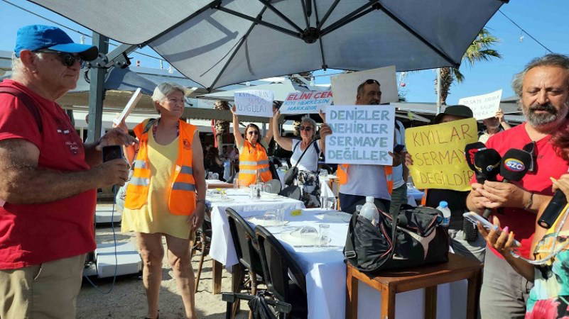 “Kıyılar Halkındır, Tüm İşgaller Kalkıncaya Kadar Kıyılardayız” yazılı pankart ve “Kıyılar Halkındır”, “Kıyı Kanununu Uygula”, “Elini Çek, Kıyılar Halkındır”, “Denize Erişim Herkesin Hakkı”, “Kıyılar Halkındır, Halkın Olacak” yazılı dövizler taşıyan eylemciler, sloganlar atarak şezlong ve kumsala yerleştirilen masaların arasından yürüdü.