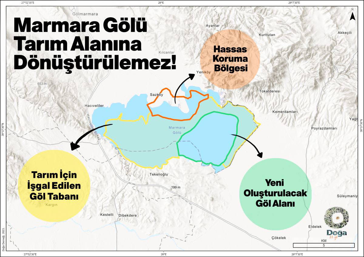 Doğa Derneği Yönetim Kurulu Başkanı Dicle Tuba Kılıç konuya ilişkin yaptığı açıklamada “Marmara Gölü yanlış su ve tarım politikalarıyla kurutulmuştur. Yaşanan kuraklık iklim değişikliğinin bir sonucu gibi gösterilemez. Biyolojik çeşitlilik açısından dünya ölçeğinde öneme sahip bu gölün resmi kurumlar tarafından tarım alanına dönüştürülmesi kabul edilemez. Marmara Gölü’nde yapılmak istenen tarımsal faaliyetler ulusal ve uluslararası mevzuata aykırı. Marmara Gölü Sulak Alanı Rehabilitasyonu adı altında gölün TİGEM tarafından tarım alanı olarak kullanılmasına karar verildi. Bu protokole açtığımız davanın ardından göldeki tarım faaliyetleri için ÇED gerekli değildir kararı alındı. Bu karara da dava açtık. Sivil toplum kuruluşları ve bölge insanıyla birlikte Marmara Gölü’ndeki yaşamın hakkını savunmaya devam edeceğiz. Marmara Gölü’nün yok edilmesi sadece buradaki biyolojik çeşitliliği değil gölün sağladığı ekosistemi ve tarımsal üretimleri de olumsuz etkileyecek” diye konuştu.