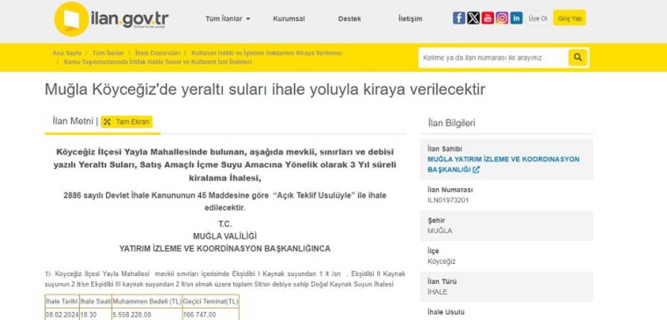Muğla Valiliği Yatırım İzleme ve Koordinasyon Başkanlığı (YİKOB), Köyceğiz’in Yayla Mahallesi’ndeki yeraltı sularını satışa çıkardı. 8 Şubat (yarın) açık teklif usulüyle ile gerçekleşecek ihale için 166 bin 747 TL geçici teminat bedeli istenirken, muhammen bedel ise 5 milyon 558 bin 220 TL olarak belirlendi.