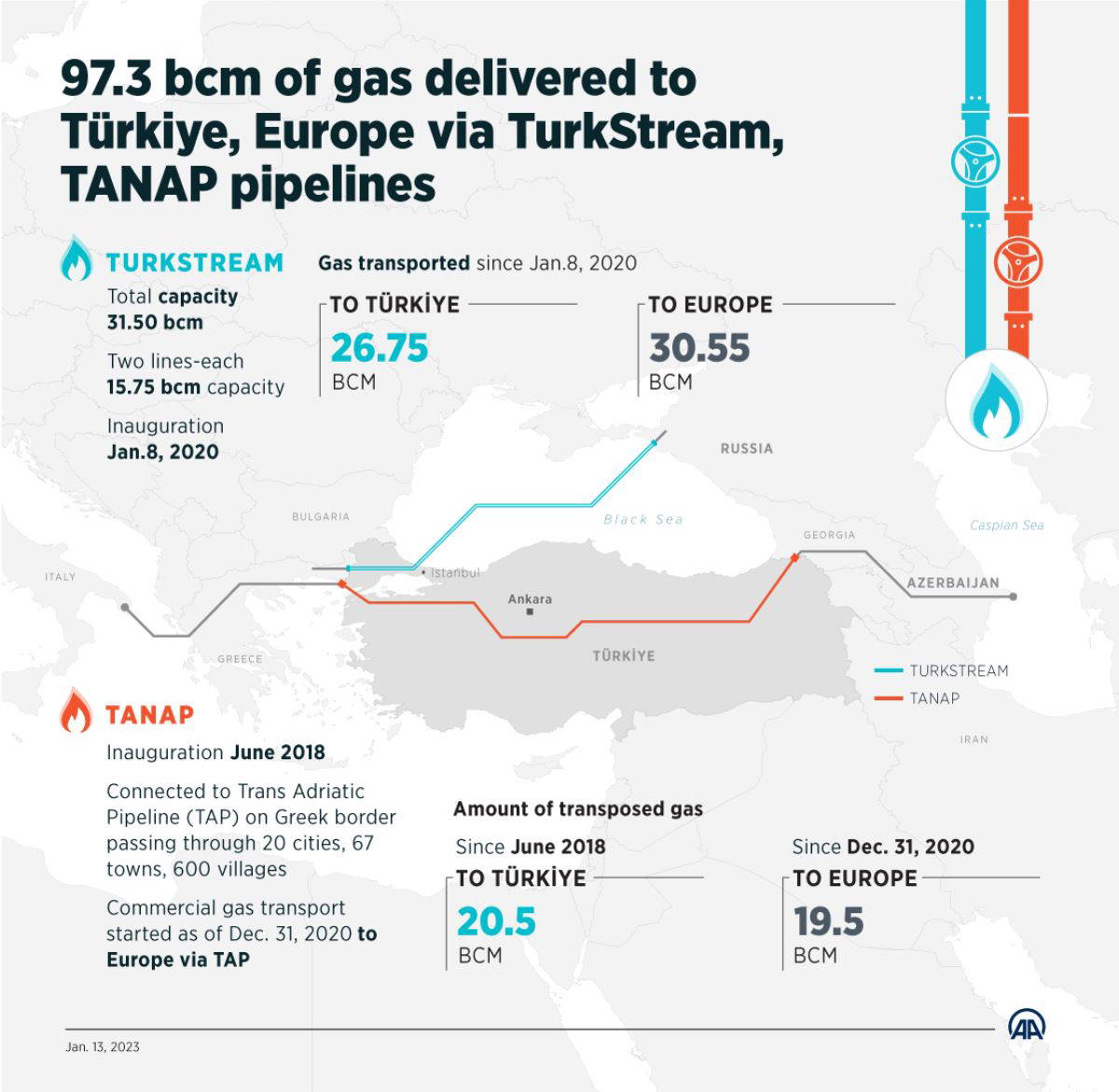 A total of 97.3 billion cubic meters (bcm) of gas has been carried through TurkStream Natural Gas Pipeline and the Trans Anatolian Natural Gas Pipeline (TANAP) to Türkiye and Europe, according to data compiled by Anadolu Agency on Friday.