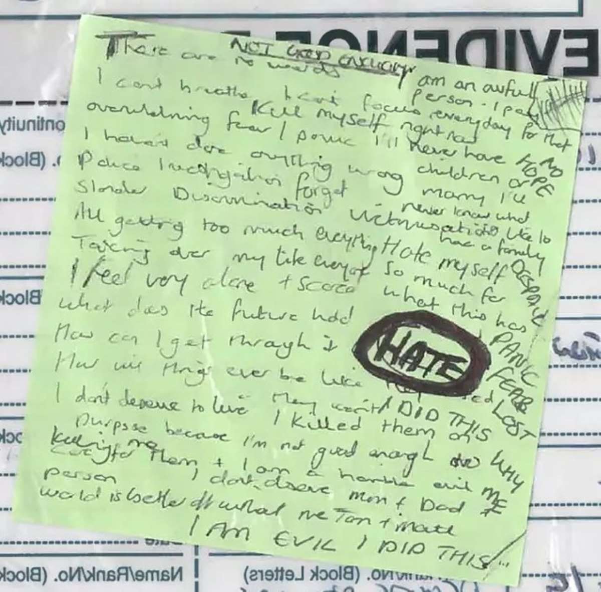 One note read, "I don't deserve to live. I killed knowing them because I'm not good enough to look after them well." Another remark contained phrases such as "I'm a horrible bad person" and "I'm bad. I did this."