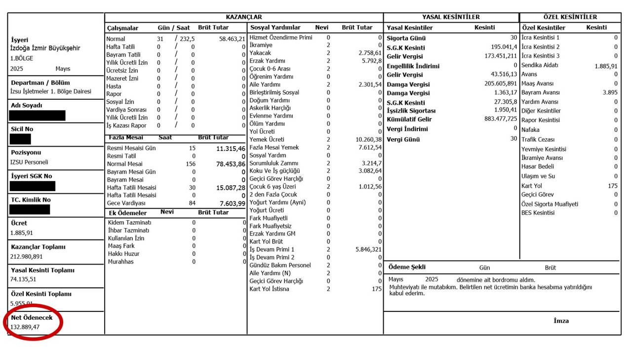 İzmir Büyükşehir Belediye Başkanı Dr. Cemil Tugay, Türk-İş Genel Başkanı Ergün Atalay’ın İzmir Büyükşehir Belediyesi ve Belediye –İş Sendikası arasında geçen dönem imzalanan toplu sözleşme ve sonrasında yaşanan sürece ilişkin açıklamalarına bordro ile yanıt verdi. Bir büyükşehir belediye başkanı, sorumlu bir kamu yöneticisi olarak sabırlı ve itidalli olmaya, zorunlu işten çıkarma sürecini akıl ve mantık sınırları içinde mağduriyet yaratmadan çözüme kavuşturmak için diyalog içinde kalmaya çalıştıkça sürekli olarak Belediye-İş yetkilileri tarafından doğru olmayan beyanlarla itham edildiğini aktaran Başkan Tugay, “Son olarak Türk-İş Genel Başkanı Ergün Atalay da maalesef bu kervana katılarak ‘bizim arkadaşlarımızın sendikasını itibarsızlaştırdılar’ ve ‘işçiler 50-55 bin lira para alıyor’ şeklinde beyanlarda bulundu. Sayın Ergün Atalay, tevatür ile somut gerçeğin farkını ekte sunduğum iki bordroyla fark edeceksiniz diye düşünüyorum. Bordrolarda, net ve brüt ücretleri görebilirsiniz. Bu da sizin için yeterli olmazsa, bordrolardaki "kümülatif gelir" kısmına bakıp ilgili aya bölerseniz (örneğin, mayıs bordrosunda 883 bin liralık kümülatif gelir, aylık 180 bin liraya tekabül eder ki) bunun aylık ortalama neti 130 bin liranın üzerinde olur. İtirazımız bu derece yüksek ücretin üzerine Eylül 2025'te gelecek zamdır, eylül zammından feragat istiyoruz” ifadelerini kullandı.