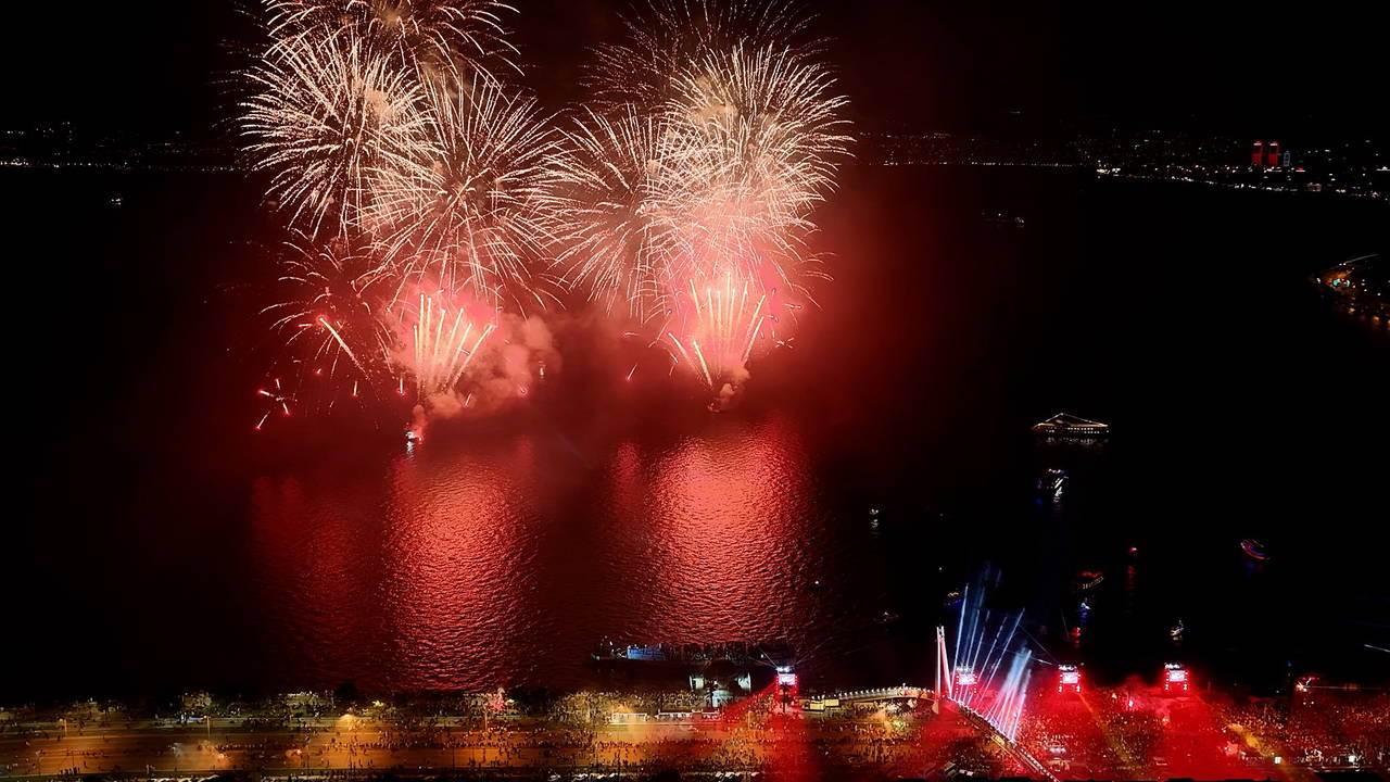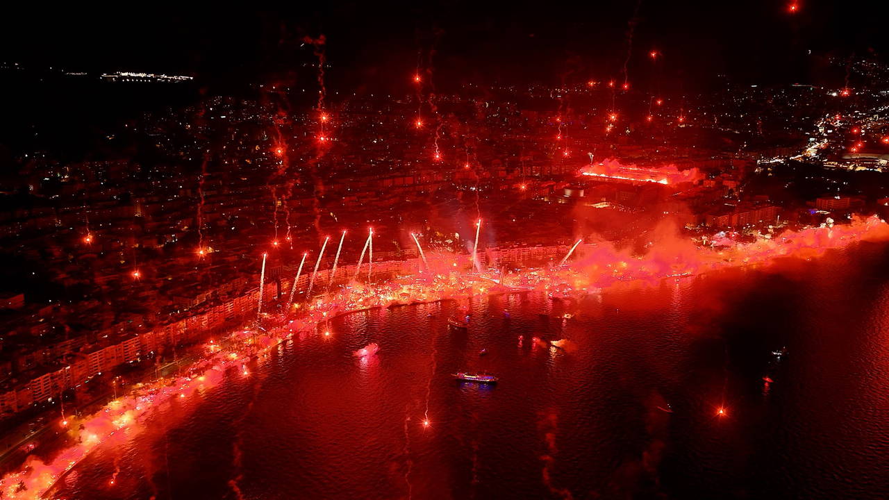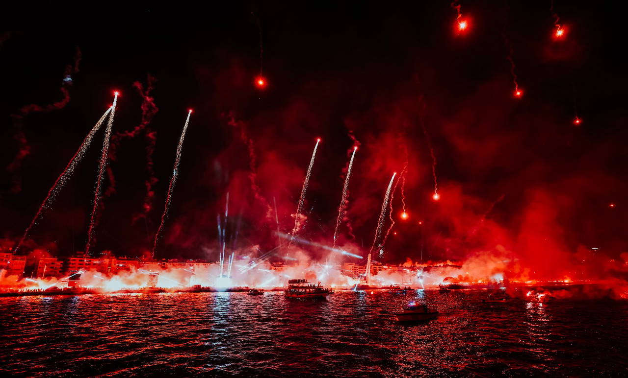 Denizden sahil şeridi inanılmaz güzel görünüyordu. Sahilde Göztepe-Güzelyalı hattında kurulan sahnede DJ performansı yanında ses ve ışık gösterileri coşkuyu doruğa çıkarmak için bir altlıktı. Her iki taraftan pankart ve flamalarla kaplanan Güzelyalı Üst Geçidi de ışık gösterilerinin başka bir adresiydi. Asıl coşkunun doruğa çıktığı an ise saatler 22.00’yi gösterdiğinde yaşandı; Susuz Dede’den gelen işaretle Göztepe Gürsel Aksel’in çatısında ve bütün sahil şeridinde kilometreler boyunca meşalelerle İzmir adeta yanıp tutuşurken denizdeki teknelerden de havai fişekler peşpeşe göğe yükselmeye başladı. Yüz bini aşan Göztepe taraftarı yüzüncü yılda coşkuyla, tarihi ve güzel bir kutlamanın ardından keyifle evinin yolunu tutarken Bergama gemisi ve tekneler de saatler 22.30’u gösterdiğinde Üçkuyular İskelesi’ne döndü. Sepil, konuklarını uğurladı. Kutlamaların bu sene erken bitmesinin nedeni, Göztepe’nin sabaha LGS sınavına girecek gençleri düşünmesiydi.