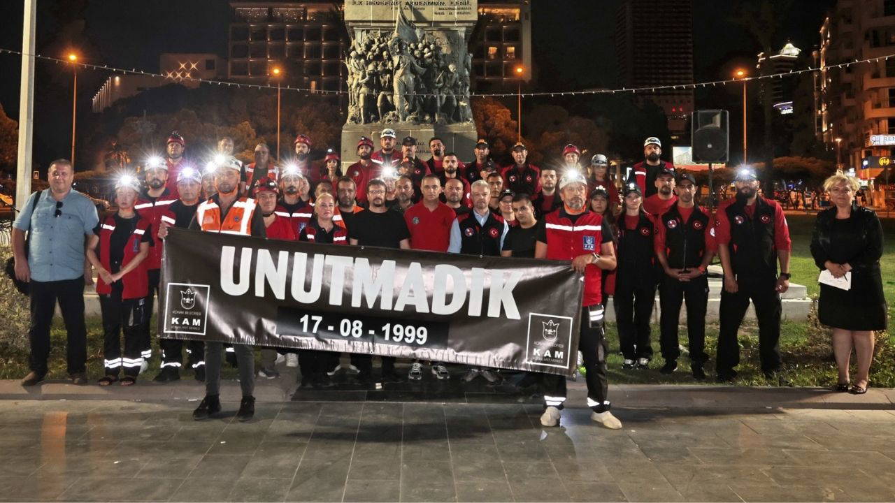 Konak Belediyesi’nin 17 Ağustos Marmara Depremi anısına düzenlediği “Sessiz Yürüyüş” ilçe belediyelerin arama kurtarma ekiplerinin katılımıyla gerçekleşti. Konak Belediyesi Afet Merkezi Arama Kurtarma Timi’yle (KAM) birlikte İzmir Büyükşehir Afet Koordinasyon Merkezi (AKOM), Balçova Belediyesi Arama Kurtarma Timi (BALKUT), Karşıyaka Belediyesi Arama Kurtarma Ekibi, Menderes Belediyesi Arama Kurtarma Ekibi (MAK), Foça Belediyesi Afet İşleri Müdürlüğü ve Karabağlar Belediyesi Arama Kurtarma ekibi Gündoğdu Meydanı’ndan Cumhuriyet Meydanı’na yürüdü. Kortejin önünde “Unutmayacağız” pankartı yer alırken yürüyüş boyunca sessiz kalınarak farkındalık yaratıldı. Ellerinde Atatürk posteri ve Türk bayrağı taşıyarak Cumhuriyet Meydanı’nda Atatürk anıtının önünde toplanan ekipler, burada İzmir Afet Bilinci, Çevre ve İklim Farkındalığı Derneği (İZ-AFED) Başkanı Servet Ertaş’ın arama kurtarma ekipleri için yazdığı şiirle karşılandı. Arama kurtarma ekipleri, saygı duruşu ve İstiklal Marşı’nı okunmasının ardından, enkaz arama kurtarma çalışmalarında yürekleri dağlayan ama bir o kadar da hayata bağlayan “Sesimi Duyan Var mı?” diye bağırarak sessiz yürüyüşü sonlandırdı. Tüm ekipler adına, ev sahibi Konak Belediyesi’nin Afet İşleri Müdürü ve KAM Ekip Lideri Şebnem Firdevs Karakaya bir konuşma gerçekleştirerek şu ifadeleri kullandı: