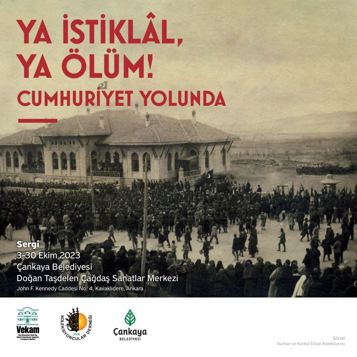 VEKAM, Koleksiyoncular Derneği ve Çankaya Belediyesi işbirliği ile Cumhuriyetin kuruluşunun 100. yılı için hazırlanan "Ya İstiklâl Ya Ölüm! Cumhuriyet Yolunda” başlıklı sergi, Doğan Taşdelen Çağdaş Sanatlar Merkezi’nde kapılarını açtı. I. Dünya Savaşı’nın sonundan Cumhuriyetin ilanına kadar olan dönemi inceleyen sergi 30 Ekim’e kadar ziyaret edilebilir.