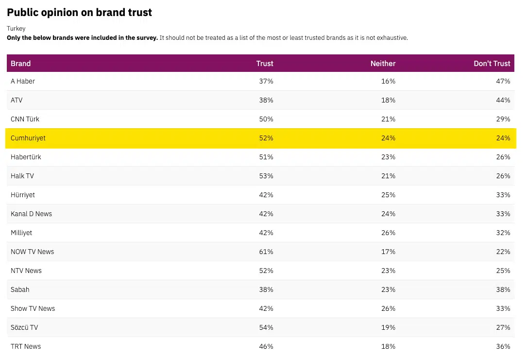 Rapora göre, 2025’te Cumhuriyet Gazetesi bir kez daha Türkiye'nin en güvenilir gazetesi seçildi. Cumhuriyet, 2023-2024 yıllarında da aynı unvanı elde etmişti.