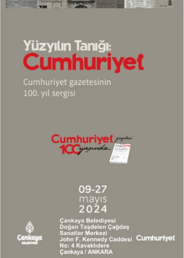 Cumhuriyet gazetesinin 100. yılı kutlamaları çerçevesinde “100 Yılın Tanığı Cumhuriyet” başlıklı sergi yarın Çankaya Belediyesi Doğan Taşdelen Çağdaş Sanatlar Merkezi’nde izleyicinin beğenisine açılacak. 27 Mayıs’a değin açık kalacak olan sergi, Cumhuriyet gazetesinin kuruluşundan başlayarak bugüne değin geçirdiği evreleri, Cumhuriyet gazetesinin çok varsıl belgeliği ve müzesinden seçilen belge, bilgi ve nesnelerle anlatıyor. Cumhuriyet’in kuruluşu, kurucusu Yunus Nadi ve ailesi, gazetenin imtiyaz sahipleri, Cumhuriyet Vakfı, yöneticileri, yazarları, çizerleri, foto muhabirleri, çalışanları, yitirdiği basın şehitleri, uğradığı baskılar, okurları, kitap yayınları, ekleri, sanatçı dostları ve spordan dış politikaya, siyasetten kültüre çeşitli alanlarda tarihsel sürece tanıklık eden gazete sayfalarını içeren sergiyi Çankaya Belediyesi ve Cumhuriyet gazetesi ortaklaşa gerçekleştirdi. Küratörlüğünü Dilek Karaaziz Şener’in gerçekleştirdiği sergiyi; Işık Kansu hazırladı, tasarımını Tasarımhane’den Akın Canko ve Bora Canko yaptı. Küratör Dilek Karaaziz Şener, sergiye ilişkin görüşlerini şöyle açıkladı: