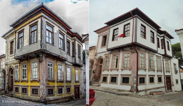 (Solda, Venezis’in Ayvalık’taki eski evi. Foto: Mikhael Kalafatas. Sağda, evin günümüzde restore edilmiş durumu. Foto: Özay Sır Kurunaz)