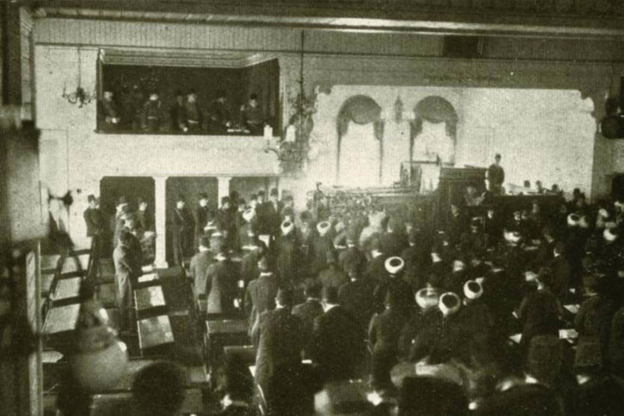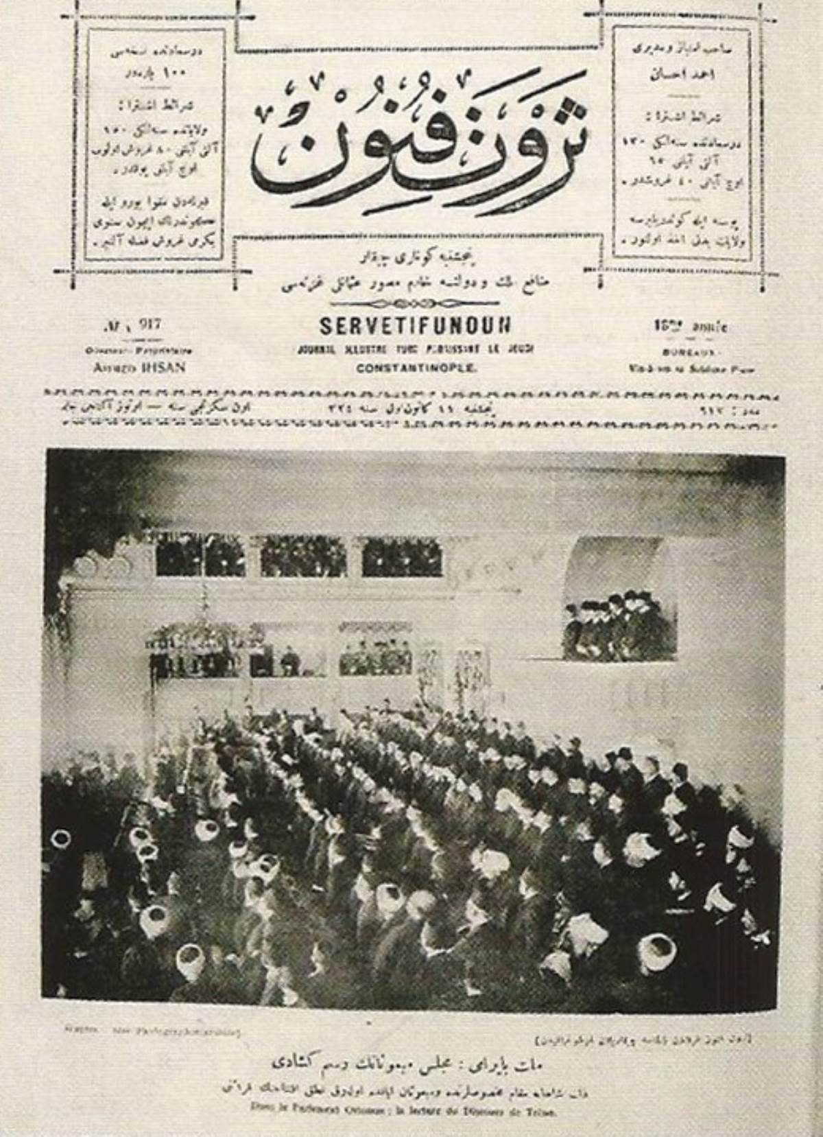 17 Aralık 1908- Meclis-i Mebusan’ın II. Meşrutiyetle yeniden açılışı. Sultan II. Abdülhamid alt orta locada ayakta duruyor. (Servet-i Fünun gazetesi)