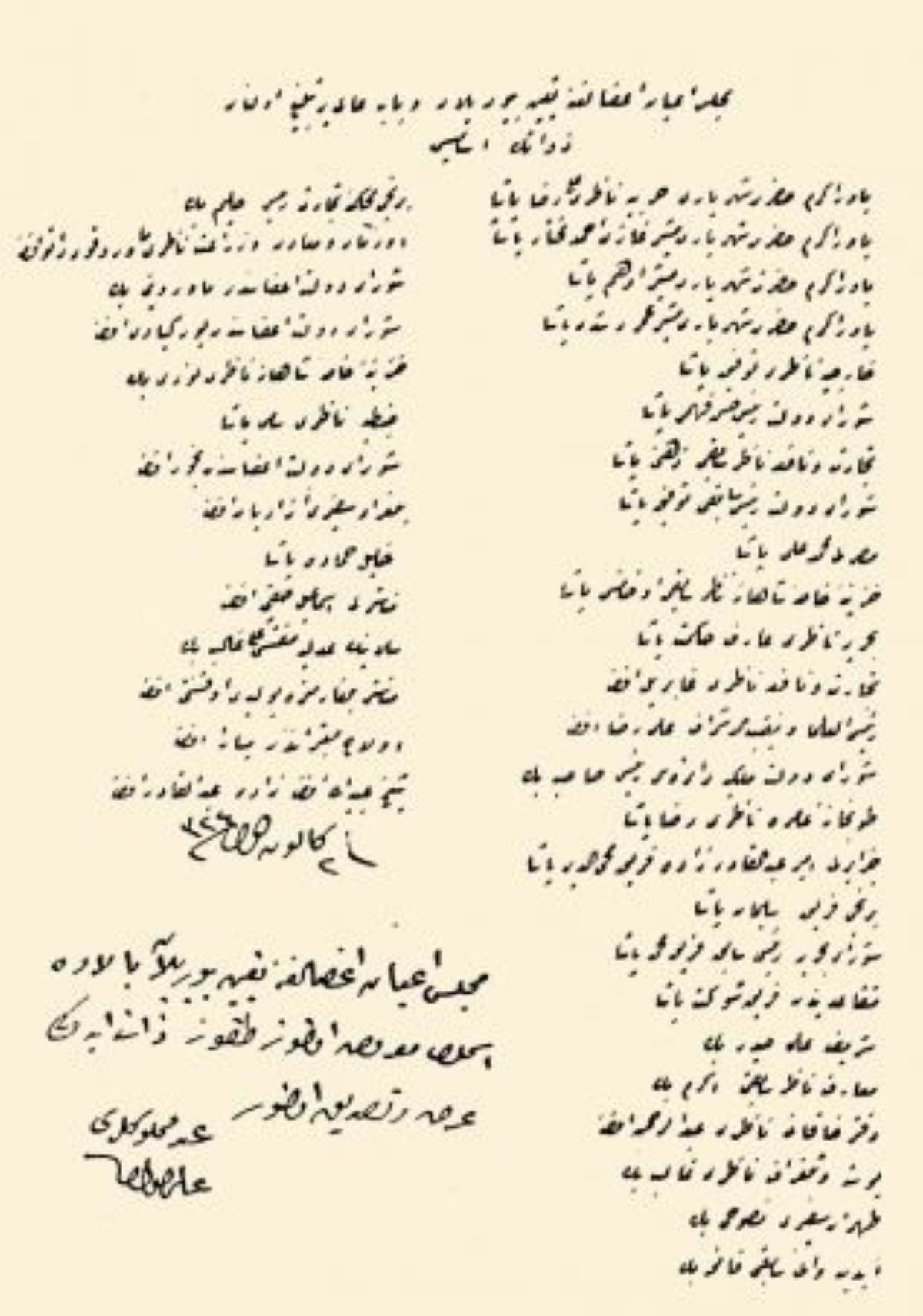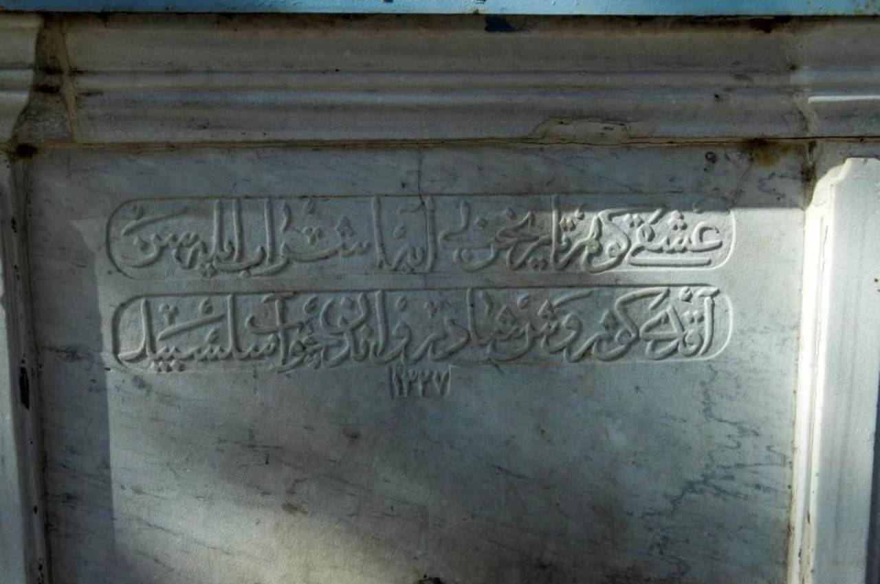 “Aşki, gevher tarihin bi-aba işrab eyle sen/Akdı şadırvandan kevser gibi cennet suyu. Sene 1327”