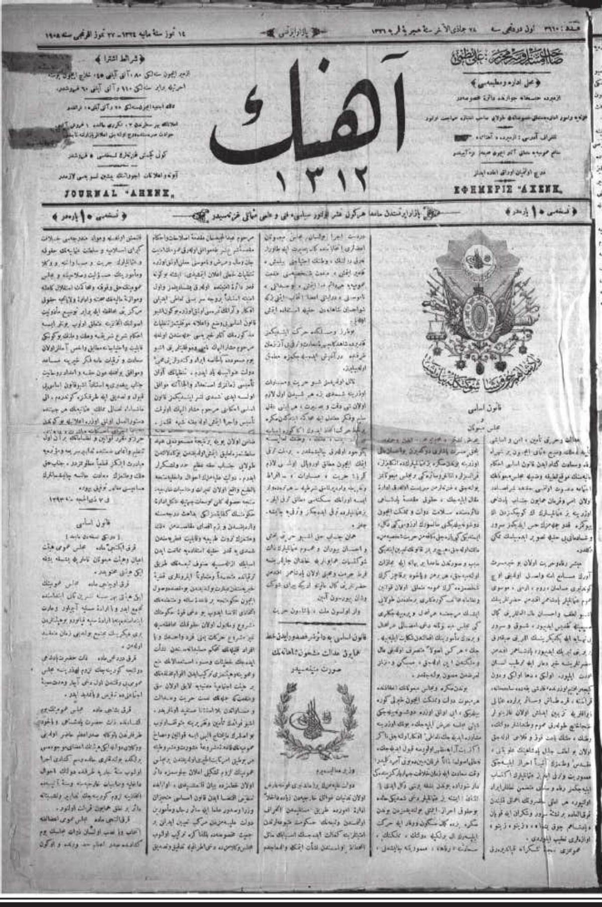 İzmir’de Ahenk gazetesi 27 Temmuz 1908 Kanuni Esasi ilanı