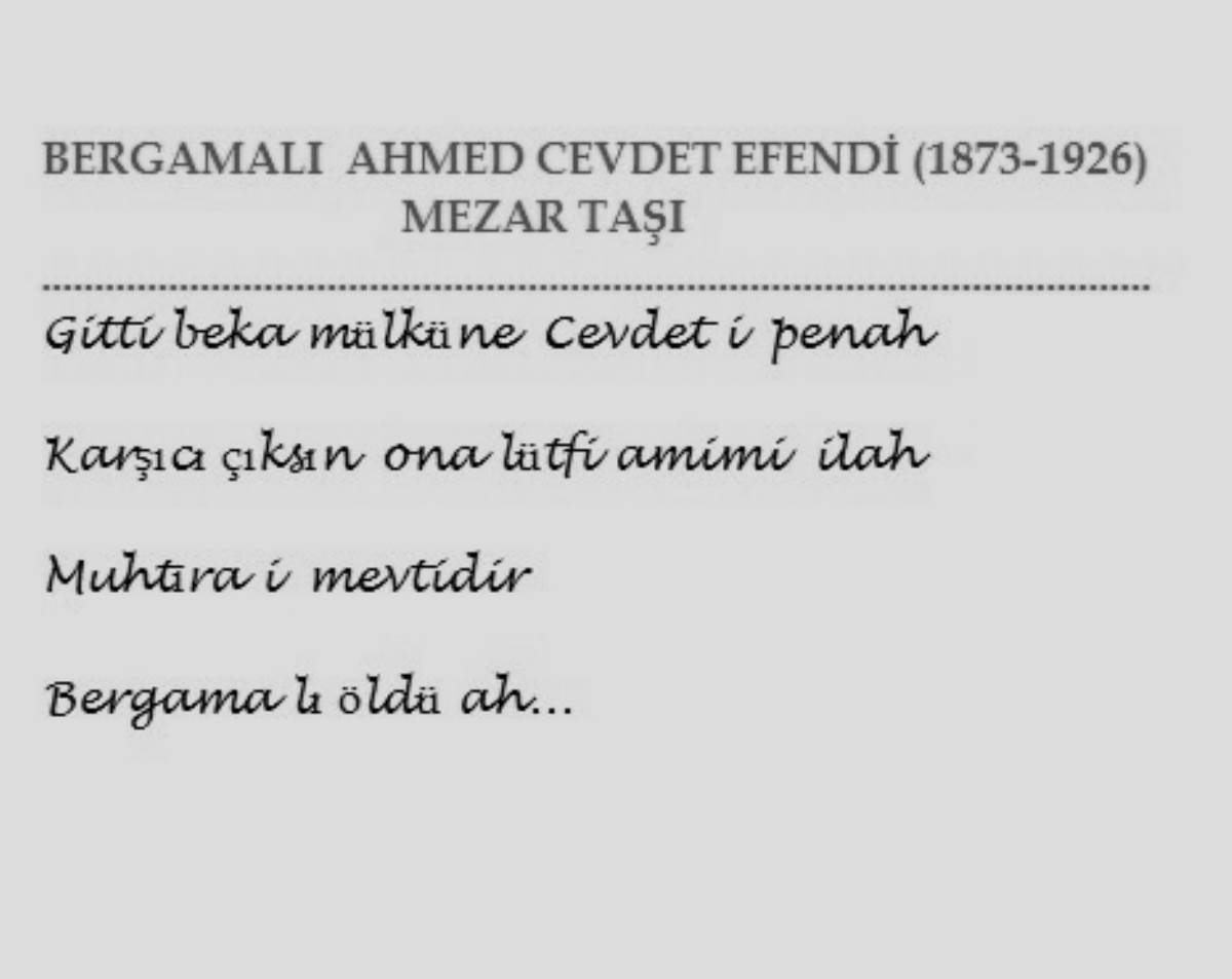 (İrfanlı insan Cevdet daimî mülküne gitti/ Allah’ın lütfu karşılasın onu/Bu ayrılışın ifadesidir/Ah Bergamalı öldü/ST)