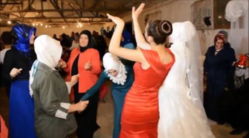 Eşi düğüne gelemeyen kadınlar, erkek kardeşi olmayan bekar kızlar kız kıza dans ederek eşlik ediyor genç evlilere.
