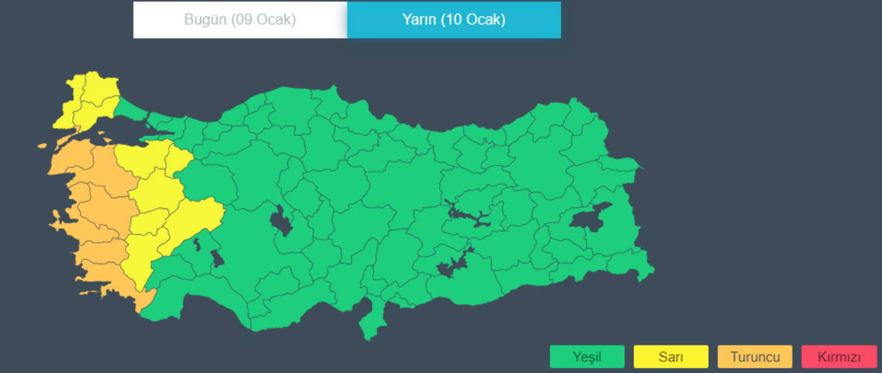 Yapılan açıklamada "10.01.2023 Salı günü Ege'de Çanakkale, Balıkesir, İzmir, Manisa, Aydın, Muğla kuvvetli fırtına (70-90 km/sa) ve zaman zaman tam fırtına (90-100 km/sa) şeklinde esmesi beklendiğinden; çatı uçması, ağaç ve direk devrilmesi, ulaşımda aksamalar, soba ve doğalgaz kaynaklı baca gazı zehirlenmeleri gibi olumsuzluklara karşı dikkatli ve tedbirli olunmalıdır” ifadeleri kullanıldı.