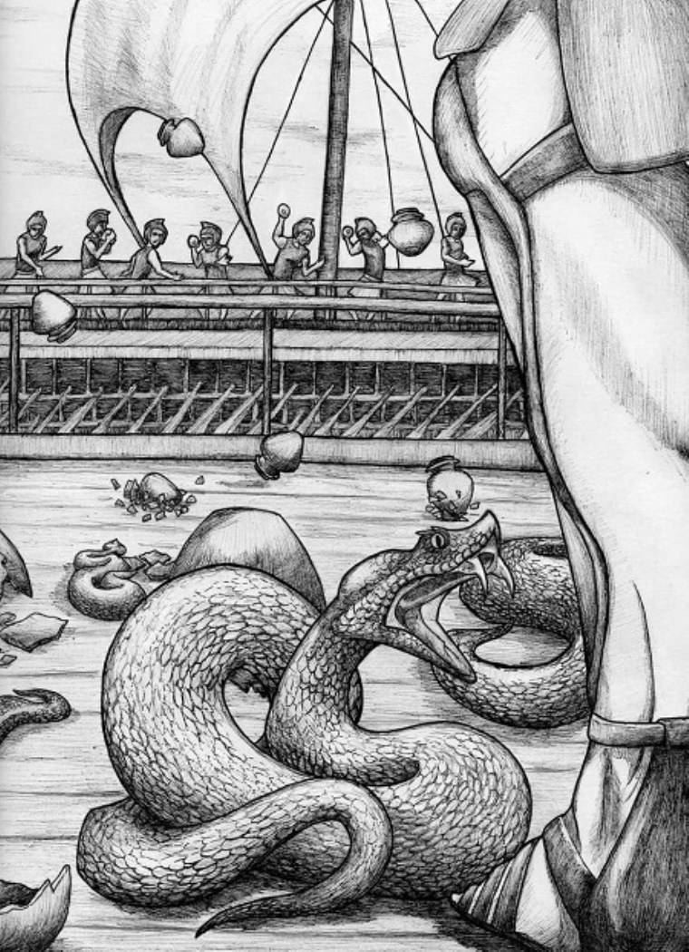 İlk kaplar düşman gemilerinin güvertelerine düşüp kırılınca, ortalığa yılanlar saçıldığında Pergamon askerleri önce bunu bir şaka sayar, kahkahalar atar.