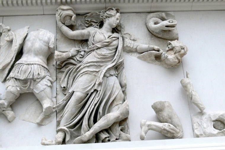 ABD’li çağdaş tarihçi Jerome Politt bu duruma işaret eder ve Bergama’dan Berlin’e kaçırılmış Zeus Sunağı frizlerinden birindeki önemli bir ayrıntıya dikkat çeker.