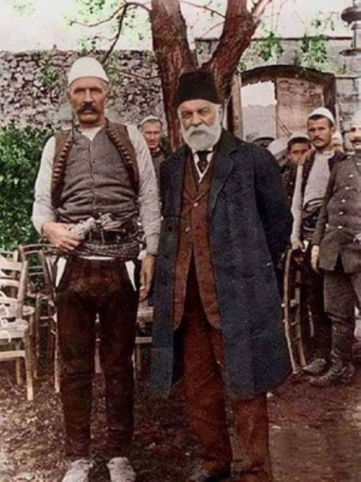 Arnavutluk Devletinin kurucusu İsmail Kemali ve Arnavut önderlerden İsa Bolatin. Arkada, Mehmet ve kardeşi Zahit Konjuhi.
