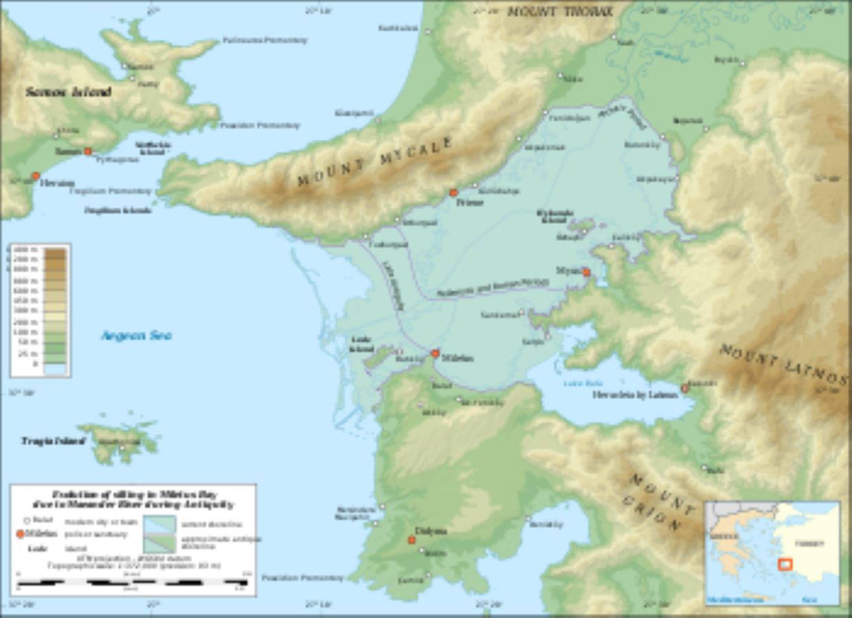 B.Menderes taşıdığı birikintilerle denizi doldurunca önce Priene sonra Miletos bu dolgunun içinde kaldı, denizden uzaklaştı.
