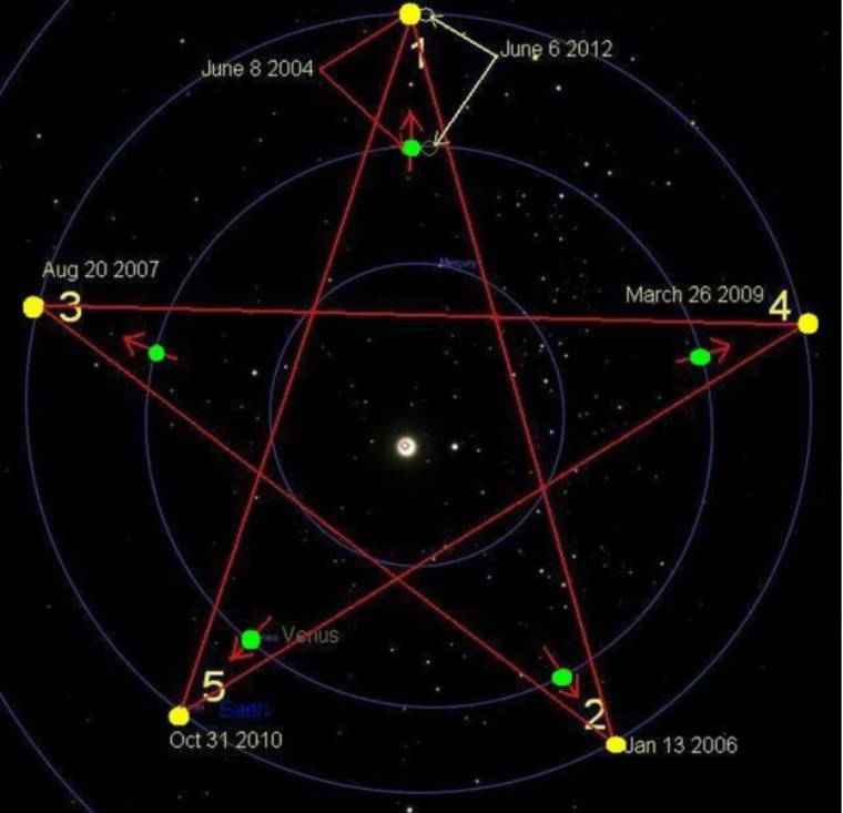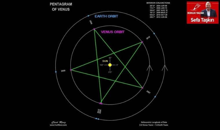 Üstelik Venüs “Zodyak”ın, tepemizde görünen göksel kubbenin içinde tam bir tur atarken, bu dizilişlerin olduğu noktaların bir “beşgen” (pentagram) oluşturması gözlemcilerin bu duruma gizemli anlamlar yüklemesine yol açtı.