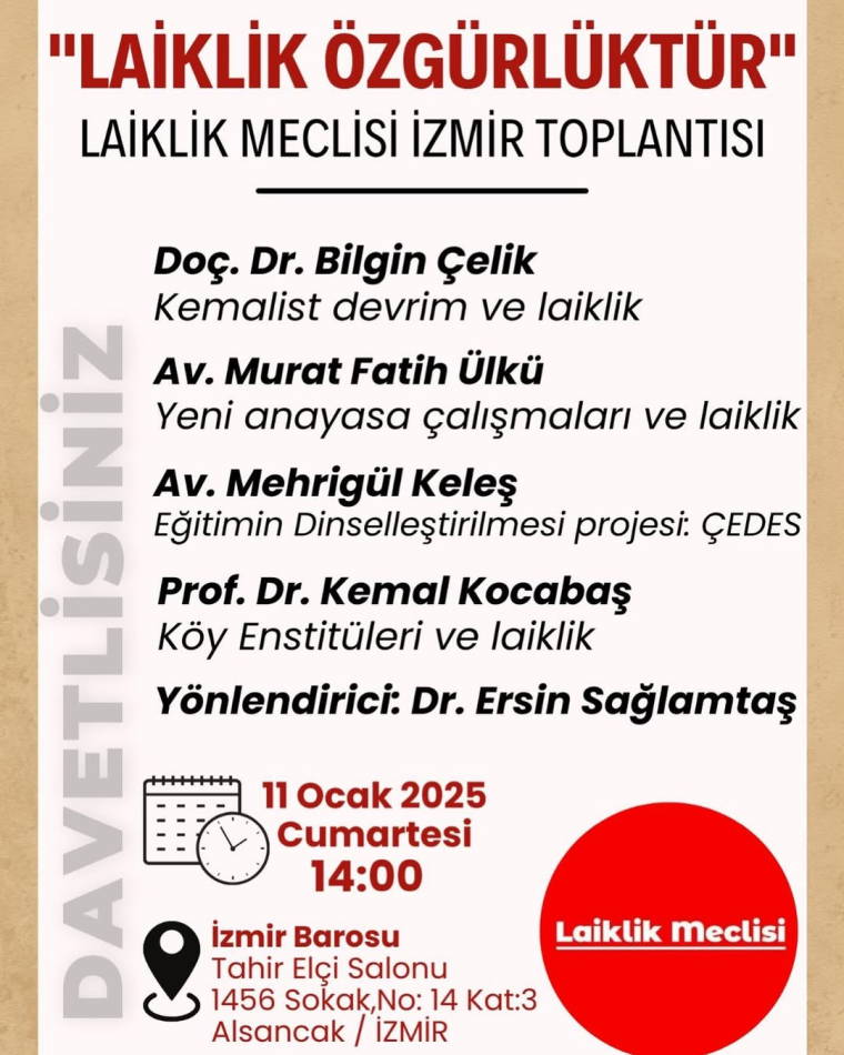 Laiklik ilkesinin korumak için kurulan Laik Meclisi, İzmir’de toplanacak. Laiklik ilkesinin konuşulacağı “Laiklik Özgürlüktür” başlıklı bir de panel düzenlenecek. Dr. Ersin Sağlamtaş'ın motaratörlüğünde Doç. Dr. Bilgin Çelik, Av. Murat Fatih Ülkü, Av. Mehrigül Keleş ve Prof. Dr. Kemal Kocabaş’ın katılımıyla 11 Ocak 2025 Cumartesi saat 14.00’de İzmir Barosu Tahir Elçi Salonu’nda düzenlenecek panelde uzmanlar ÇEDES'ten yeni anayasa tartışmalarına kadar birçok konu üzerinde konuşacak.