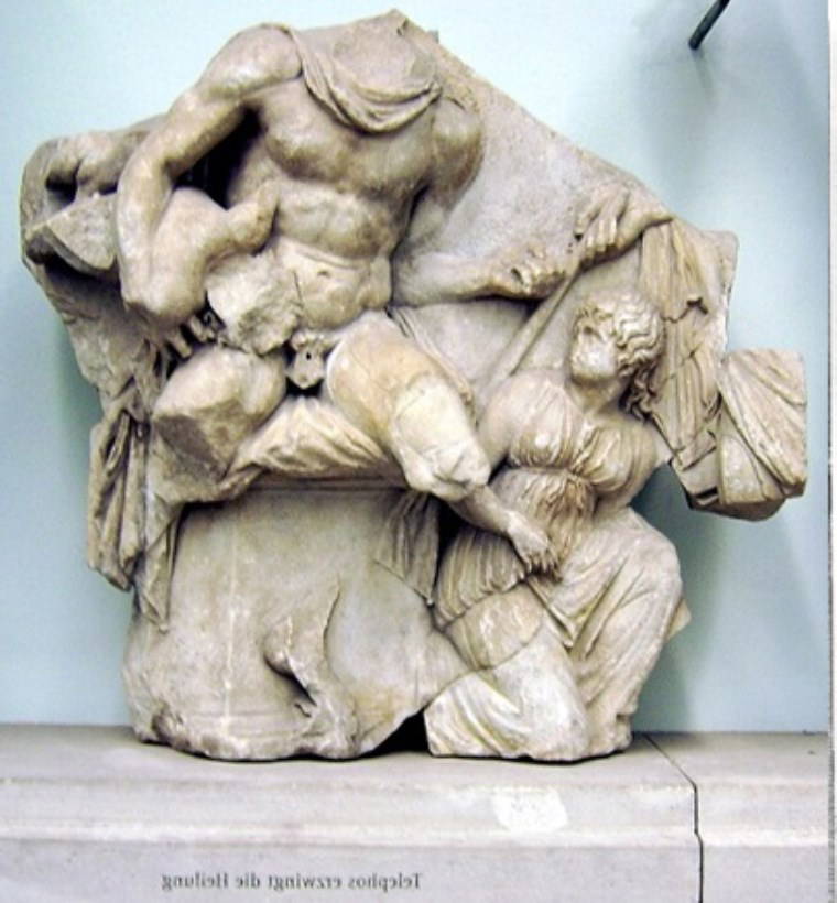 Telephos’un Orestes’i rehin alışı. Bergama’nın Berlin’e kaçırılmış Zeus Sunağının iç frizlerinden mermer parça. Panel 42