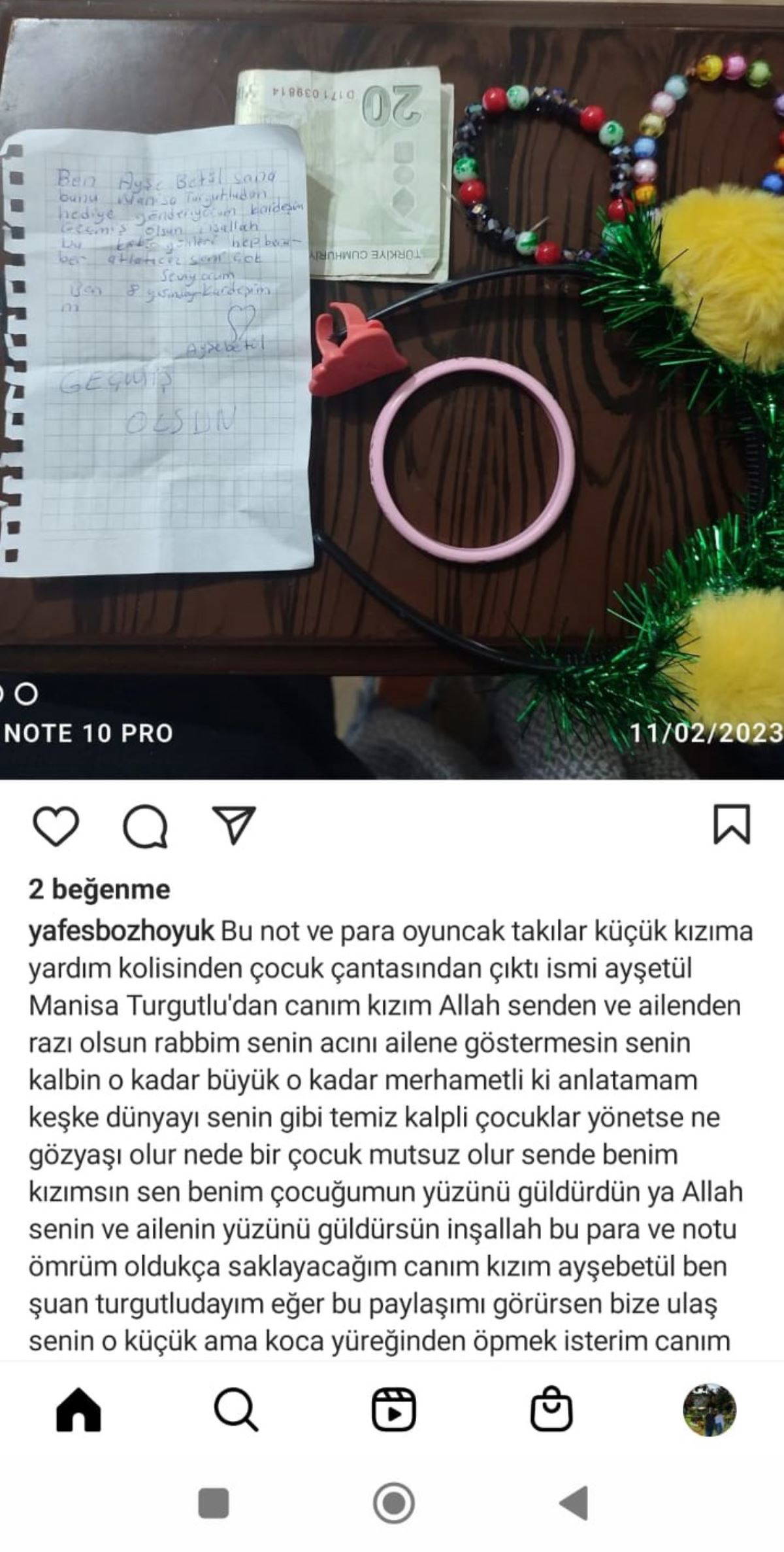 Deprem bölgesinden Turgutlu’ya gelen depremzedelere kapılarını açan Turgutlu Belediyesi Kültür ve Sosyal İşler Müdürlüğüne bağlı Dosteli Merkezleri aracılığıyla yürekleri ısıtan bir olay da yaşandı. Dosteli Merkezlerine yazdığı notla birlikte oyuncaklarını ve takılarını bağışlayan 8 yaşındaki Ayşe Betül Altınbaşak’ın yardımı, Kahramanmaraş’ta depremden etkilenen ve Turgutlu’ya akrabalarının yanına gelen Yüsra Bozhöyük ve ailesine ulaştı. Yüsra Bozhöyük’ün babası Yafes Bozhöyük, kişisel sosyal medya hesabından notu ve paketten çıkan eşyaları paylaşarak Ayşe Betül’ü ve ailesini aradığını ve de buluşmak istediğini yazdı. Turgutlu Belediye Başkanı Çetin Akın ve Turgutlu Belediyesinin sosyal medya hesaplarında da baba Yafes Bozhöyük’ün mesajı paylaşılarak Ayşe Betül Altınbaşak ve ailesi arandı. Çok kısa süre içerisinde Ayşe Betül’e ve ailesine ulaşıldı.