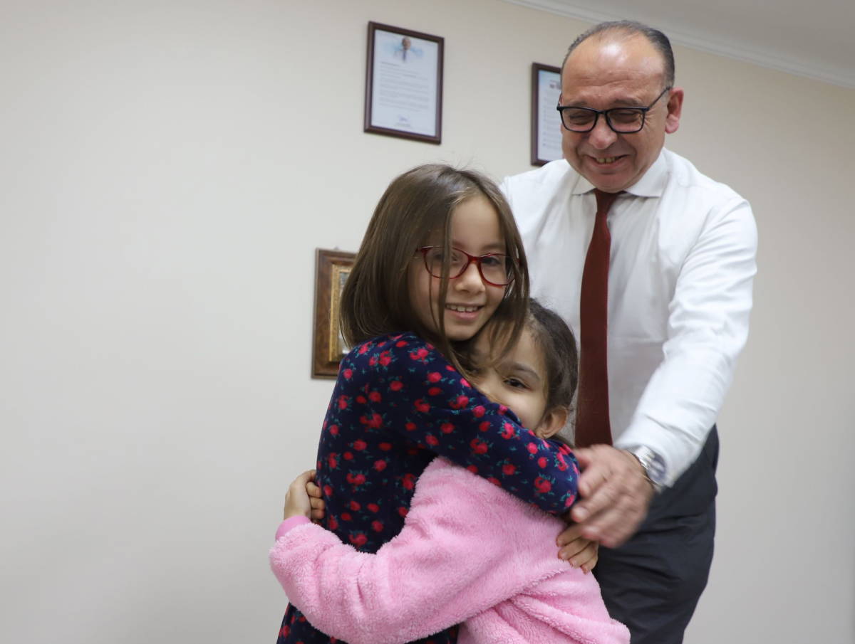 Turgutlu Belediye Başkanı Çetin Akın, Başkan Yardımcıları Fırat Honaz, Ahmet Daşkan, Evren Erbaş ile birlikte Ayşe Betül ile Yüsra’ya Nutuk, tablet ve boyama setinden oluşan paketi hediye etti.