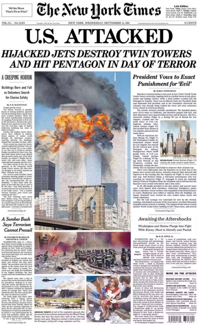 Independent Türkçe'nin aktardığına göre, Yanan İkiz Kuleler'i ilk sayfasının ortasına taşıyan The New York Times, 11 Eylül'ü "TERÖR GÜNÜ" olarak nitelendirdi.