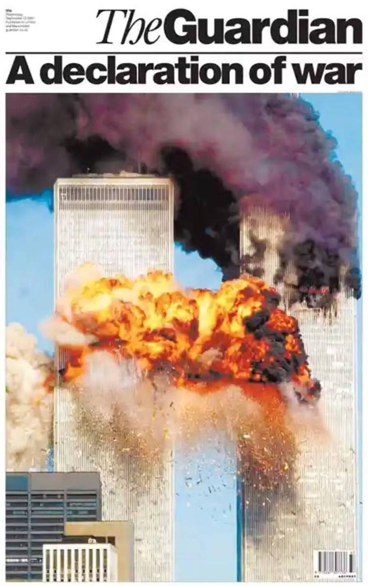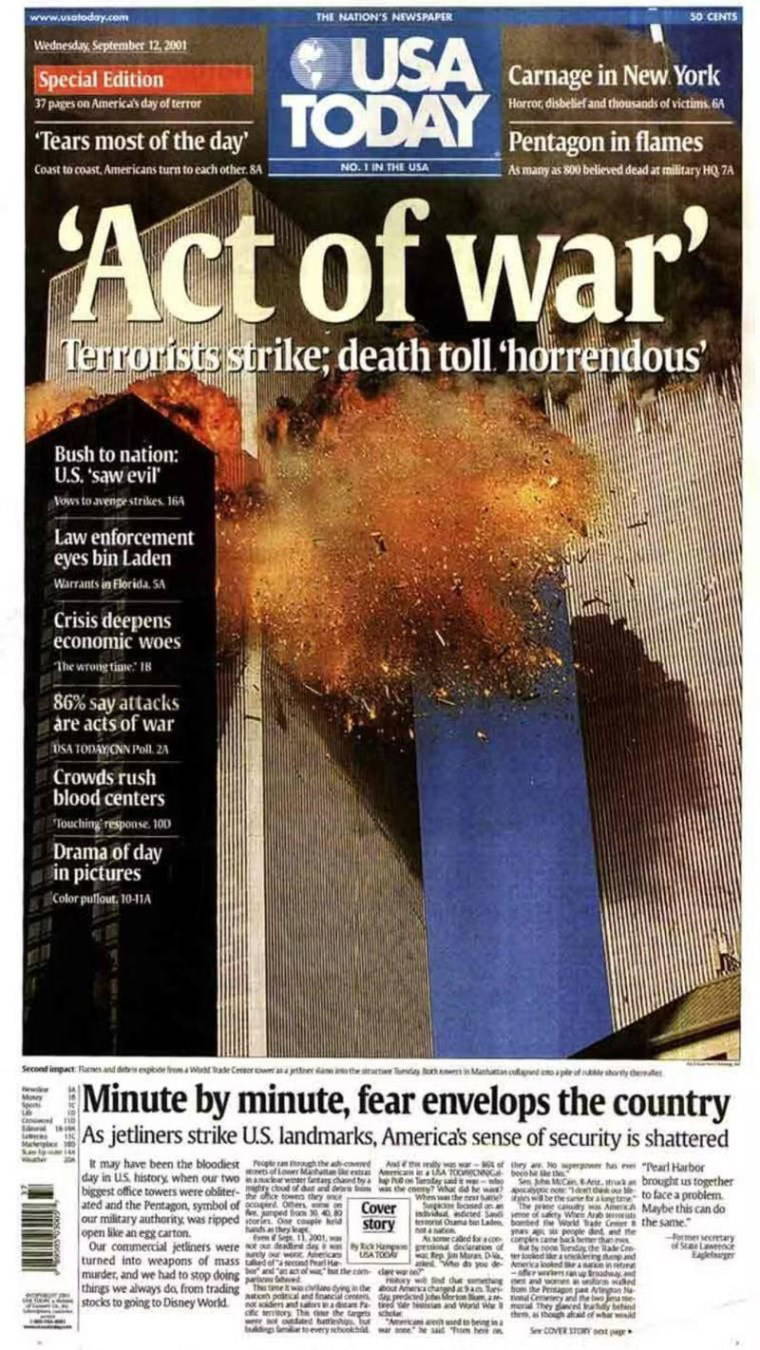 The New York Daily News de haberi aynı yerden görerek Dünya Ticaret Merkezi'ne yaklaşan ikinci uçağın dehşet verici fotoğrafını göze batan, kırmızı "BU BİR SAVAŞ" sözcükleriyle bezedi.