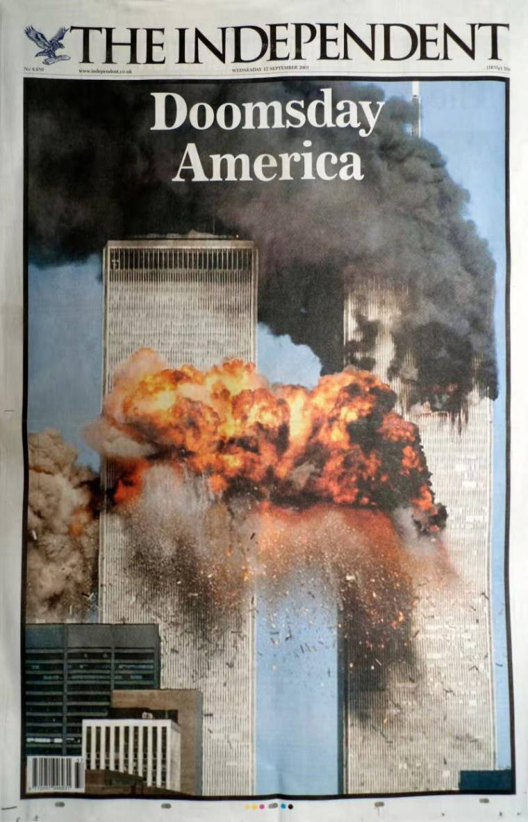 O sırada hala basılan bir gazete olan The Independent, İkiz Kuleler'in alev ve dumanlar içindeki korkunç bir resmini "Amerika'nın Kıyamet Günü" ifadesiyle manşetine taşıdı.