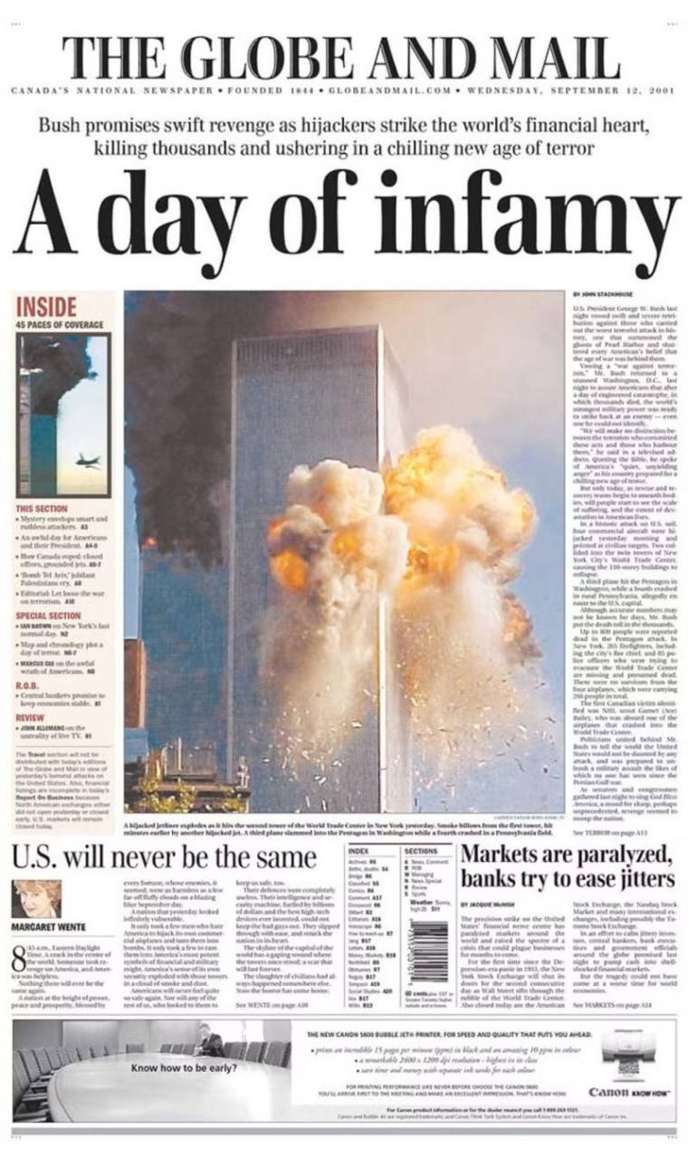 Kanada'da yayımlanan The Globe and Mail gazetesi, 1941'de Japonya'nın Pearl Harbor'ı bombalamasına ve ABD Başkanı Franklin Roosevelt'in bu olayla ilgili "rezillikle hatırlanacak bir tarih" nitelendirmesine atıfta bulundu. Bombalama, 11 Eylül'e kadar Amerikan topraklarında gerçekleşen en ölümcül yabancı saldırıydı.