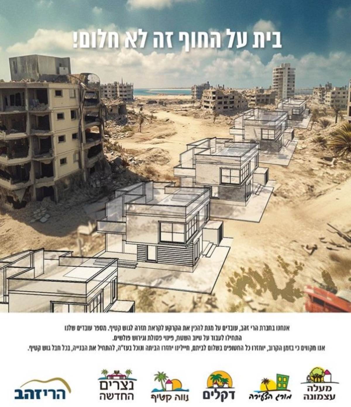 İsrailli şirketin paylaşımlarında, Gazze sahilinde villa tarzı evlerin çizimleriyle birlikte "Sahilde bir ev hayal değil! Molozları temizlemeye ve işgalcileri savuşturmaya başladık" ifadelerine yer verildi.