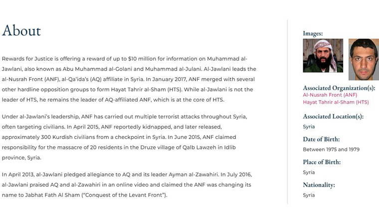 2012 yılında Suriye ile diplomatik illişkilerini kesen Washington yönetimi, 2013 yılında Colani'yi terörist ilan etmiş ve bunu yaparken de gerekçe olarak "Irak El Kaide'sinin onu, Esad yönetimini devirmek ve Suriye'de bir şeriat devleti kurmakla görevlendirdiğini" göstermişti.
