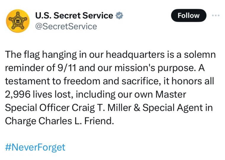Gizli Servis'in silinmiş olan paylaşımında, “Genel merkezimizde asılı olan bayrak, 11 Eylül olaylarının ve görevimizin amacının ciddi bir hatırlatıcısıdır. Özgürlüğün ve fedakarlığın bir kanıtı olan bu bayrak, aralarında Özel Memur Craig T. Miller ve Özel Ajan Charles L. Friend'in de bulunduğu 2 bin 996 kişinin anısını onurlandırmaktadır” yazıyordu.