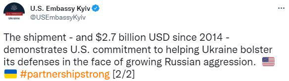 Büyükelçiliğin sosyal medya hesabı üzerinden yapılan açıklamada, ABD Başkanı Biden tarafından Ukrayna'ya yönlendirilen yardımın ilk sevkiyatının Ukrayna'ya ulaştığı belirtilerek, mühimmat da dahil olmak üzere 200 bin pounda yakın yardım içerdiği ifade edildi.
