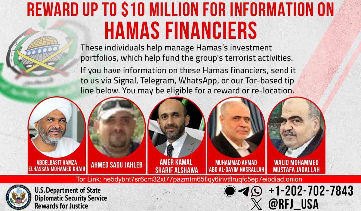 ABD Dışişleri Bakanlığı dün (Cuma) yaptığı açıklamada, Washington'un 5 Hamas finansörü hakkında bilgi veya hareketin finansman mekanizmalarını bozacak herhangi bir bilgi karşılığında 10 milyon dolara kadar ödeme yapacağını duyurdu. Ödül teklifi, ABD'nin Hamas'ın 7 Ekim'de İsrail'e saldırısı sonrasında uyguladığı dört tur yaptırımın ardından geldi.