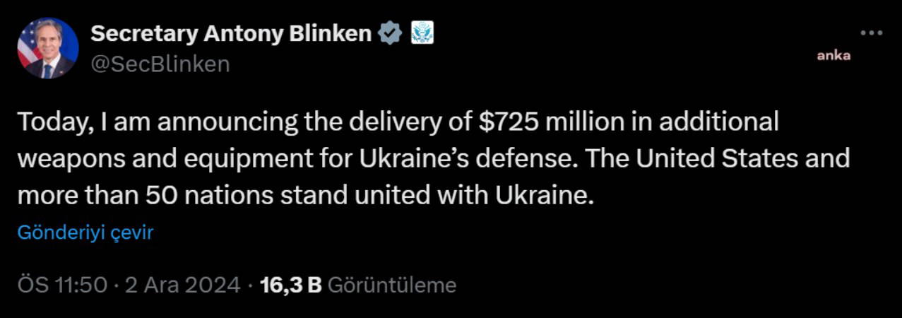 ABD Dışişleri Bakanı Antony Blinken, ABD'nin, Ukrayna'ya 725 milyon dolarlık ek silah ve teçhizat desteğinde bulunacağını duyurdu.