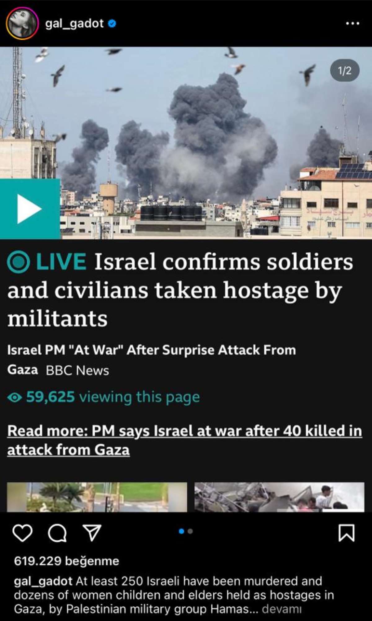 İsrailli ünlü oyuncu Gal Gadot, sosyal medya sayfasının 109 milyon takipçisiyle paylaştığı gönderide, “Filistin askeri grubu tarafından Gazze’de en az 250 İsrailli öldürüldü, onlarca kadın, çocuk ve yaşlı rehin tutuluyor” dedi.