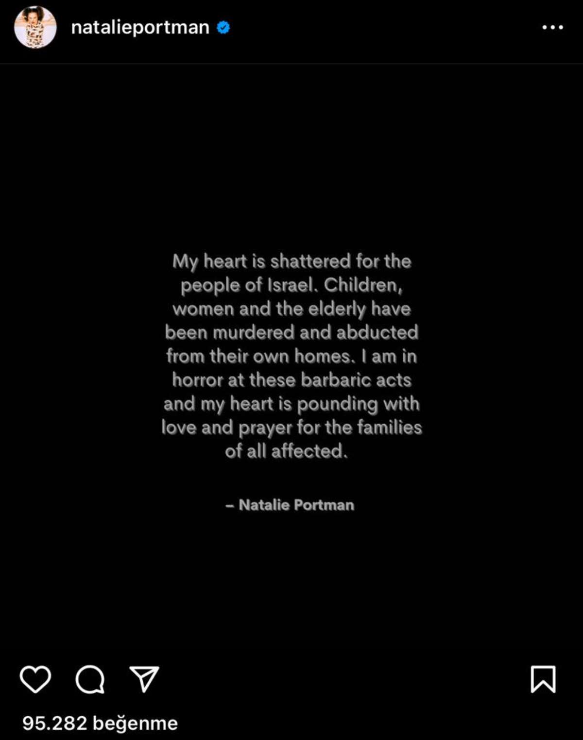 Oscar ödüllü oyuncu Natalie Portman da gönderisinde, “İsrail halkı adına kalbim paramparça oldu. Çocuklar, kadınlar ve yaşlılar öldürülüyor ve evlerinden kaçırılıyor. Bu barbarca eylemler karşısında dehşet içindeyim ve kalbim, etkilenen herkesin yanında” dedi. İsrailli oyuncu paylaşımını ise yorumlara kapattı.