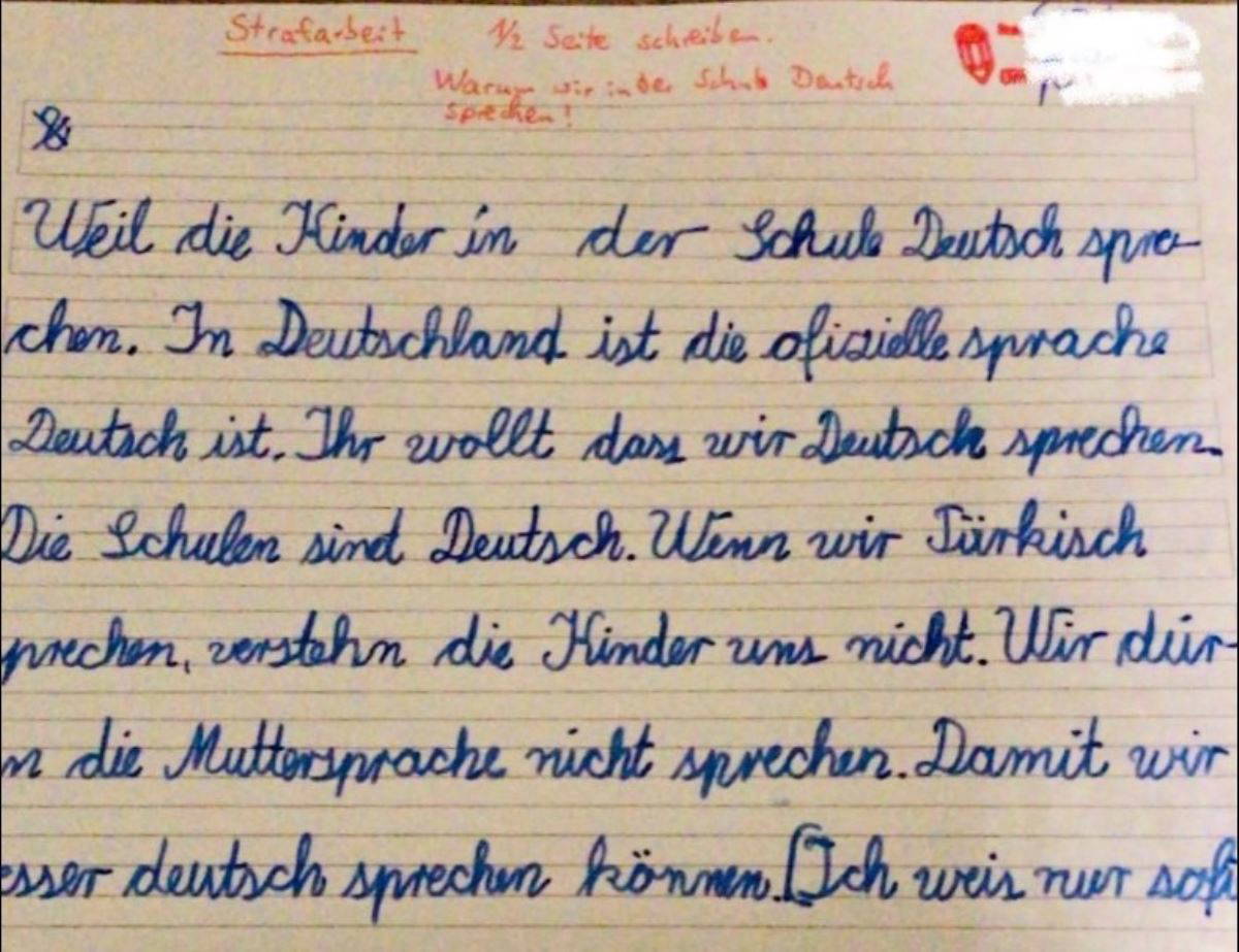 "Neden okulda Almanca konuşuyoruz!" başlıklı yazıda çocuk, "Çünkü çocuklar okulda Almanca konuşuyorlar. Almanya'da resmi dil Almanca. Almanca konuşmamızı istiyorsunuz, okullar Almanca. Türkçe konuşursak çocuklar bizi anlamaz" ifadelerine yer vermişti.
