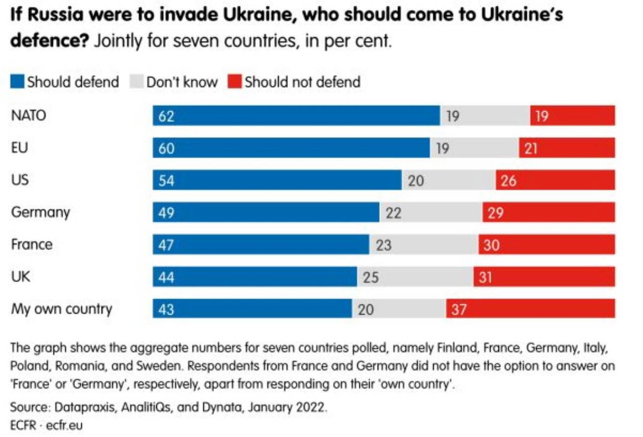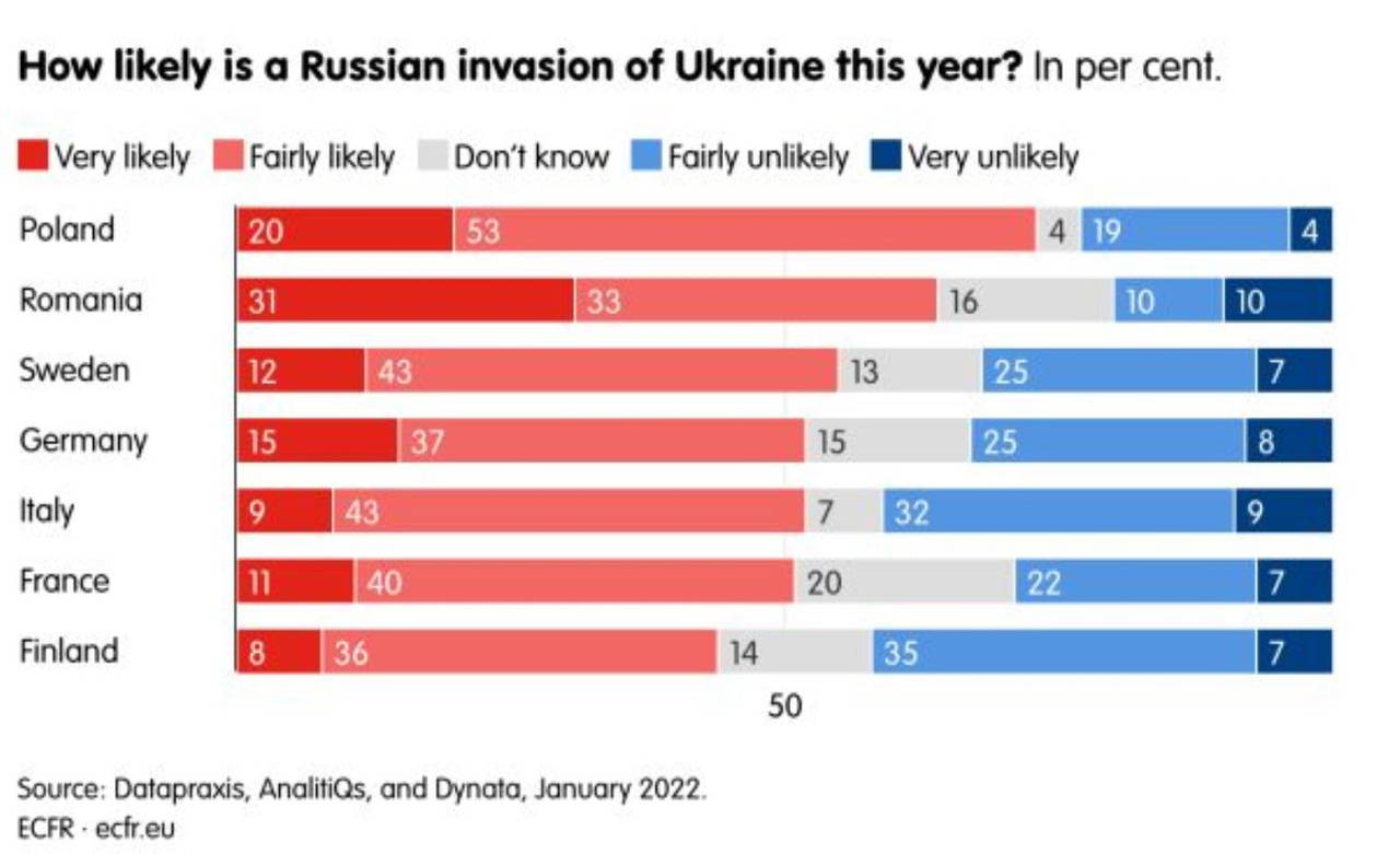 Avrupa Dış İlişkiler Konseyi (ECFR) tarafından Finlandiya, Fransa, Almanya, İtalya, Polonya, Romanya ve İsveç’te yapılan ve toplam 5 bin 529 kişinin katıldığı online ankette, Avrupalıların büyük çoğunluğun 2022 içinde Rusya’nın Ukrayna’yı işgal edeceğini düşündüğü ortaya çıktı.