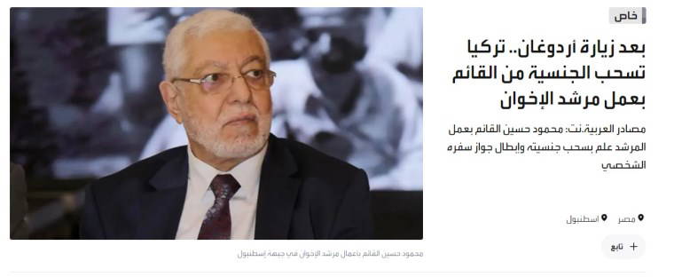 AKP'li Cumhurbaşkanı Recep Tayyip Erdoğan'ın 12 yıl sonra gelen Mısır ziyaretinin ardından, Türkiye'nin Müslüman Kardeşler'in (İhvanı Müslümin) Genel Mürşid Vekili Mahmud Hüseyin'i vatandaşlıktan çıkardığı ileri sürüldü.