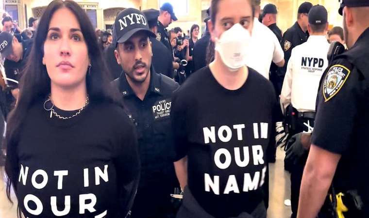 ABD'nin New York kentinde barış yanlısı Yahudi gruplar, "Barış için Yahudi Sesi" (JVP) adlı grubun çağrısıyla New York'taki ünlü Grand Central tren garında toplandı.