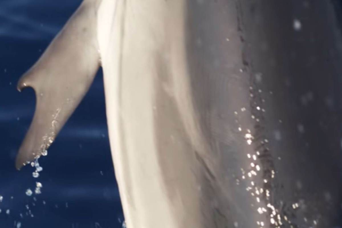 Benzersiz özelliğe sahip bu yunus balığı, İyon Denizi'nin yarı kapalı bir cebi olan ve bir karma tür yunus topluluğuna ev sahipliği yapan Korint Körfezi boyunca mutlu bir şekilde yüzerken kameraya alındı.