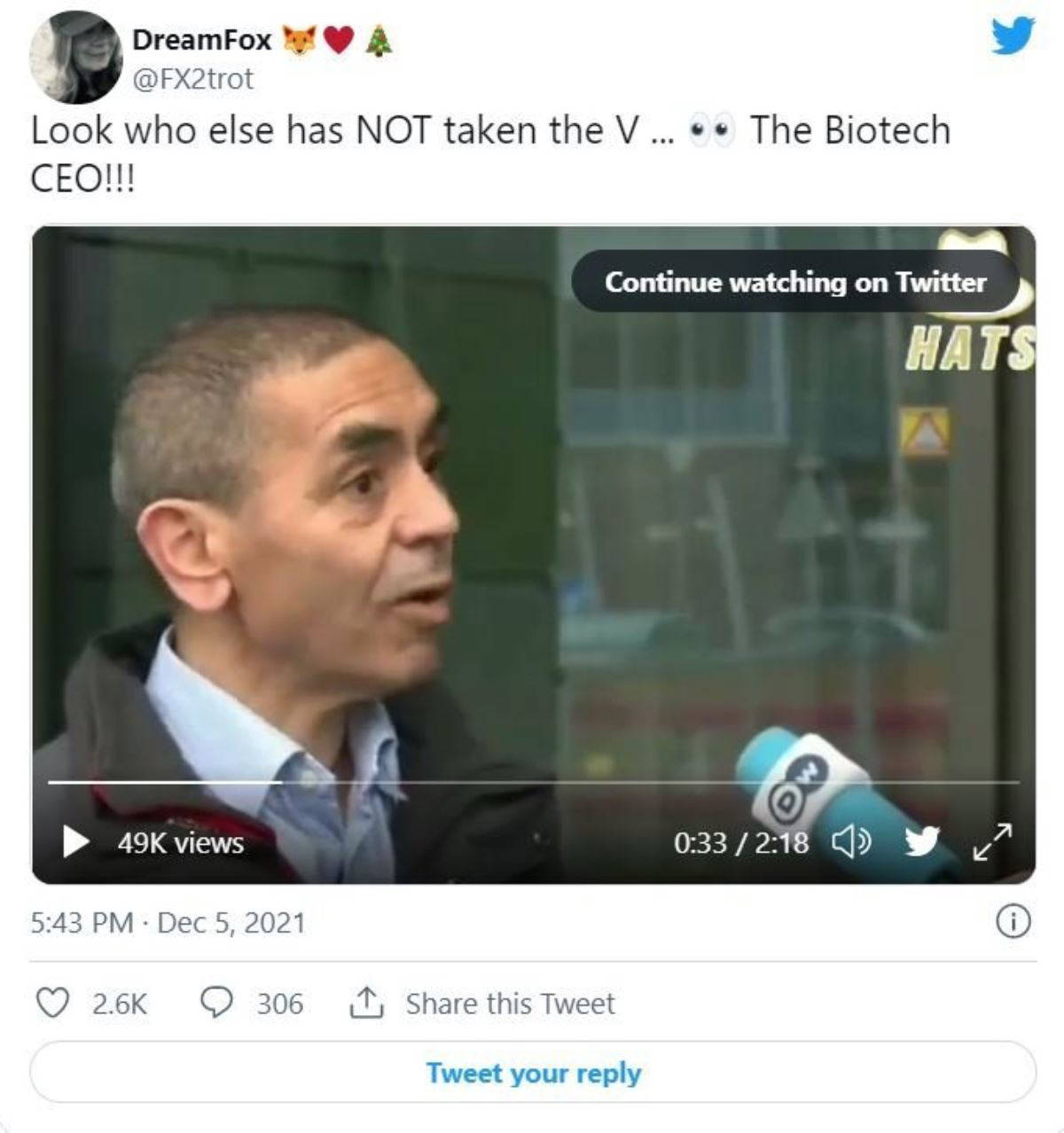 Videoyu paylaşan bazı sosyal medya kullanıcıları, "Dr. Uğur Şahin aşı ile ilgili soruya kaçamak yanıt veriyor ve yasaların aşı olmasına izin vermediğini söylüyor. Karar sizin” ve “BioNTech/Pfizer aşısının yaratıcısı güvenlik sebepleriyle koronavirüsü aşısı olmuyor" yorumunu yaptı.