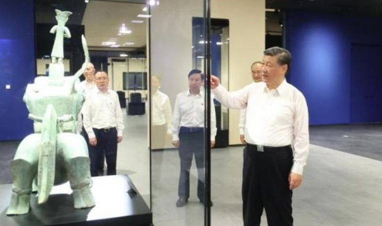 Çin'in güneybatısındaki Sichuan eyaletinin Guanghan kentinde bulunan Sanxingdui Müzesi'nin yeni binasını ziyaret eden Xi Jinping, 26 Temmuz 2023 (Fotoğraf: Ju Peng/Xinhua)