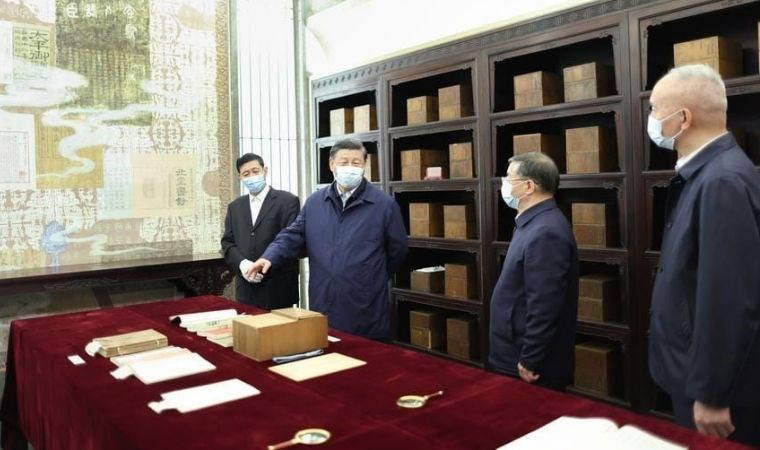 Çin'in başkenti Beijing'de Çin Yayınlar ve Kültür Ulusal Arşivi'nin sergi salonunu ziyaretinde arşiv koleksiyonundaki klasik yayınların korunması hakkında bilgi alan Xi Jinping, 1 Haziran 2023 (Fotoğraf: Ju Peng/Xinhua)