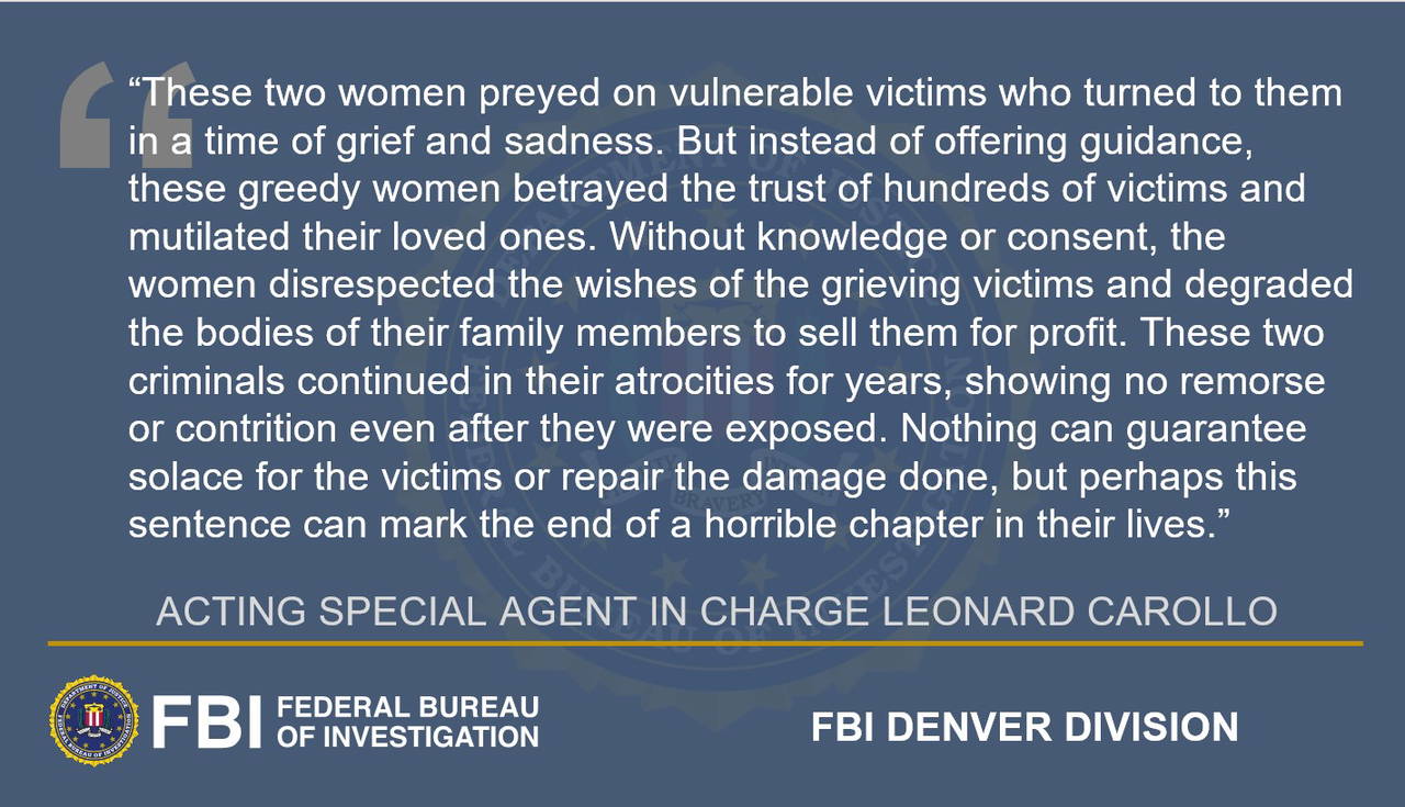 Organ satışının yasa dışı olduğu ABD'de, vücut parçalarının satışı hali hazırda ABD federal yasalarında açık bir suç olarak yer almadığı için mahkeme anne kızı, ölenlerin ailelerini dolandırma suçuyla mahkum etti. Olayı araştıran Federal Soruşturma Bürosu (FBI) bugün mahkumiyetle ilgili açıklama yaparak iki kadının, en acılı zamanlarında ailelerin güvenlerine ihanet ederek sevdiklerini parçalara ayırdığını vurguladı.